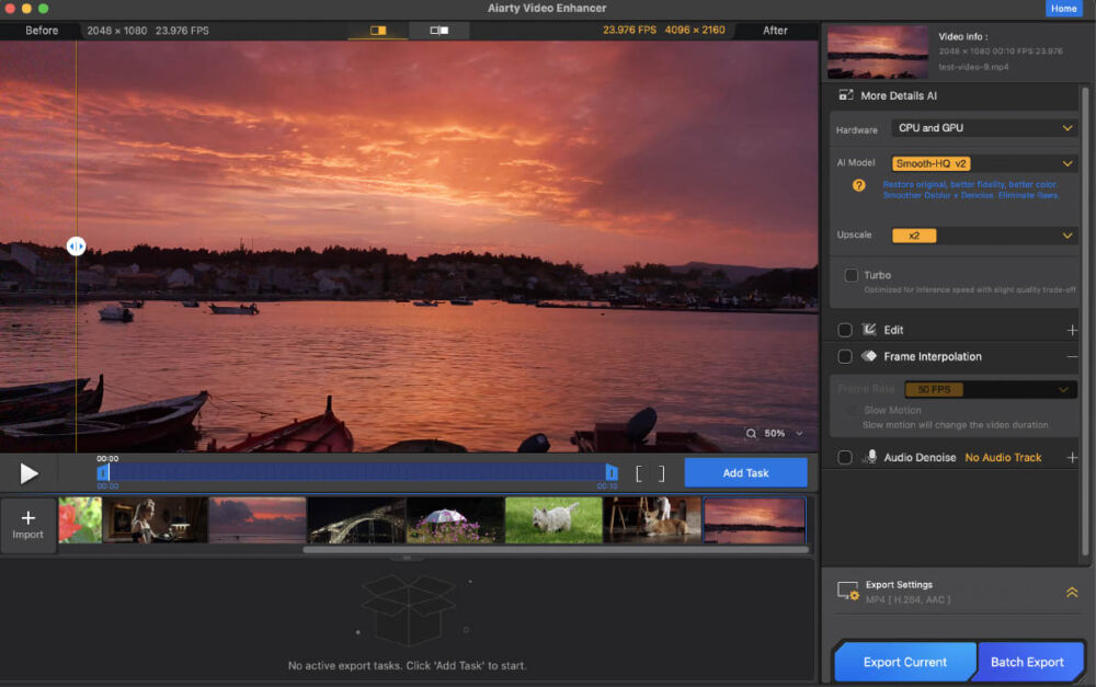 Of course, for many of us, once we dial in the processing settings we like, there are almost always multiple clips we would like to process! Thankfully, Aiarty supports batch task processing. Basically, your computer will use its processing hardware to its maximum capability, processing & exporting as many files as it can, as swiftly as possible.