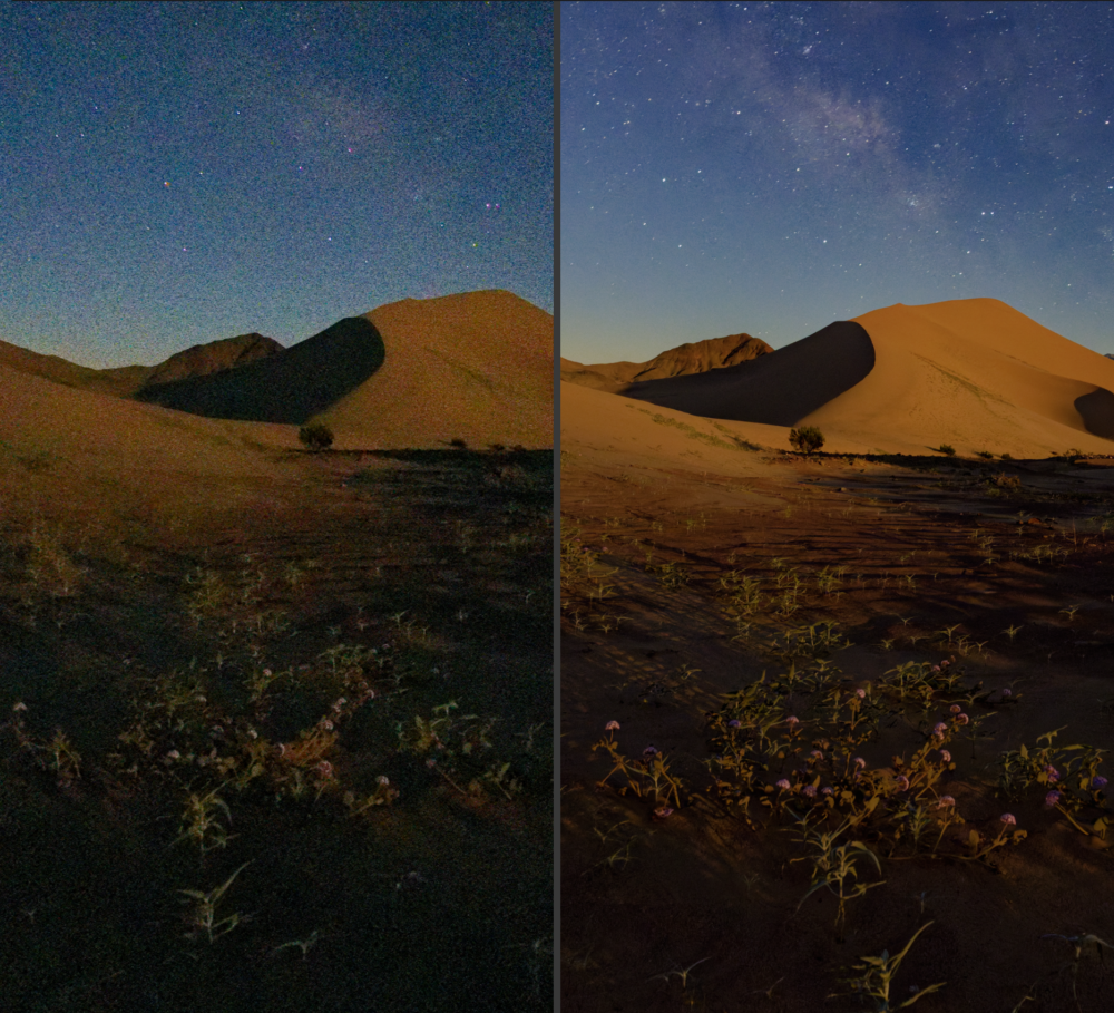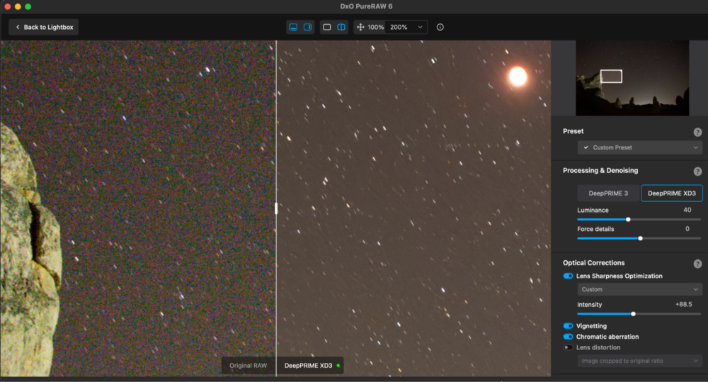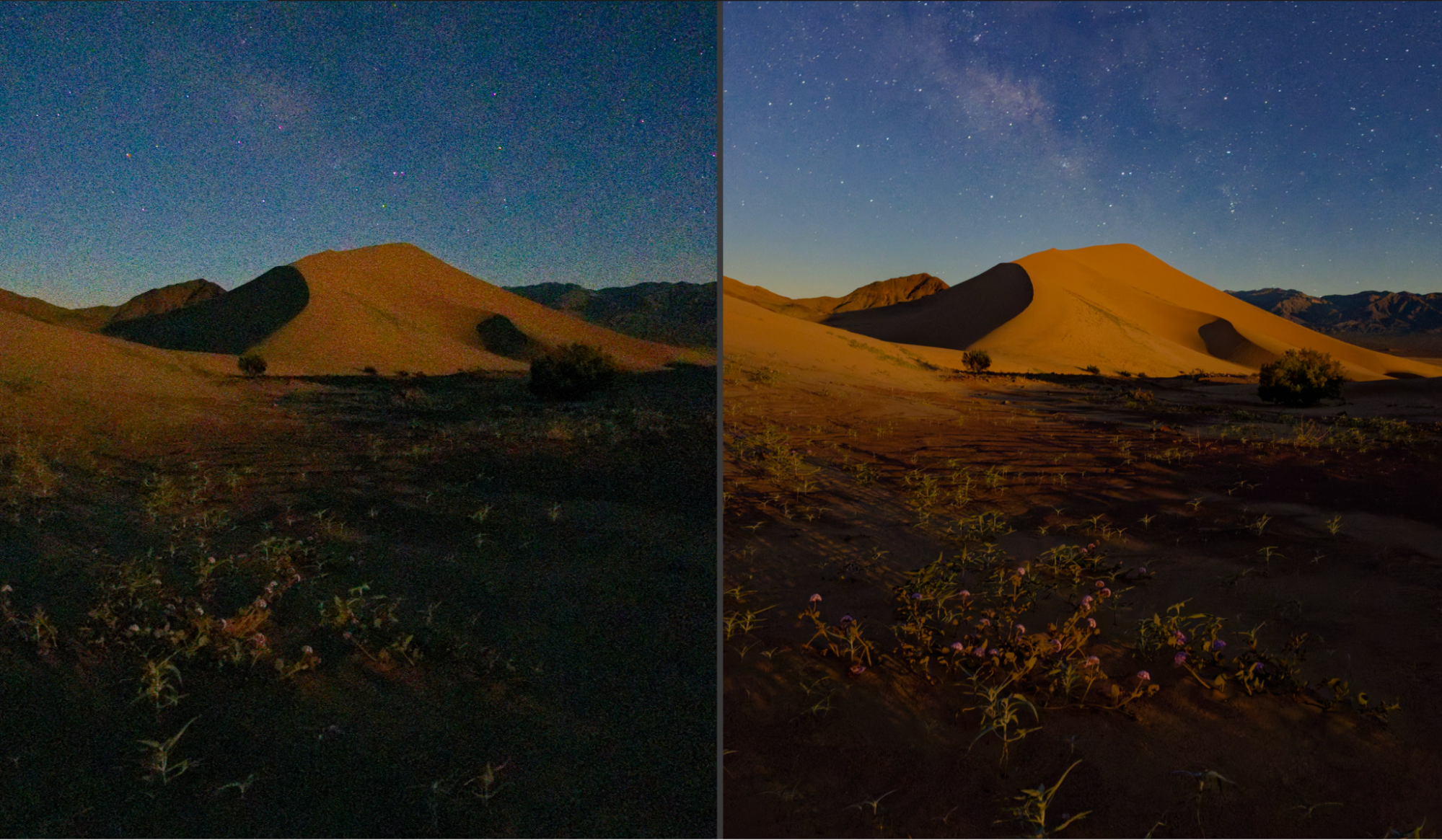 Indeed, the XD3-generated DNG files offer better fine detail; even with my Nikon and Sony cameras. I’ve tested it out with low ISO images in which I’m pushing the dynamic range to extremes, and I’ve tested it with high ISO images that are just noisy all over! Either way, the denoise and demosaic process of XD3 is often better for preserving even the toughest details such as stars in a noisy high ISO image. Once in a while, I still prefer the overall shadow response (noise reduction) of the original DeepPrime raw files.
