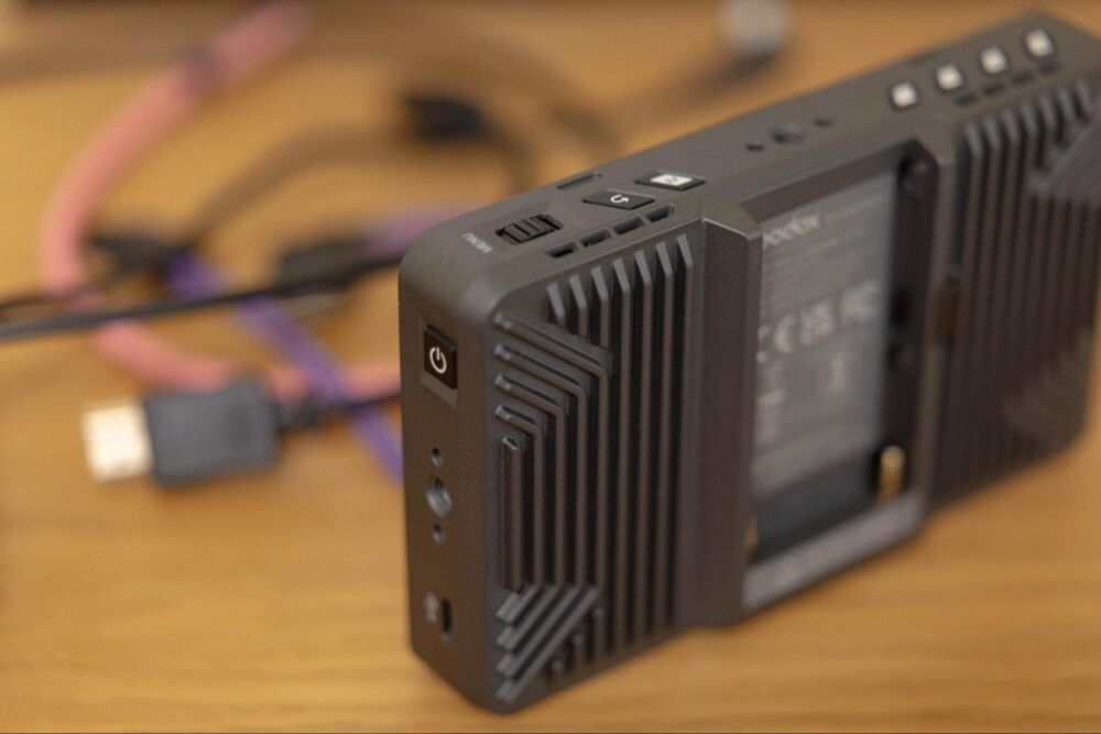 For power, you do have three options, which is fantastic: NP-F style batteries, USB-PD, and DC in. (There’s also a DC out port for carrying power to additional devices.) Unfortunately, all of these power options involve aftermarket accessories; you won’t be operational without one. Thankfully, every videographer probably already has lots of USB-PD power options, and maybe even a NP-F battery to spare.