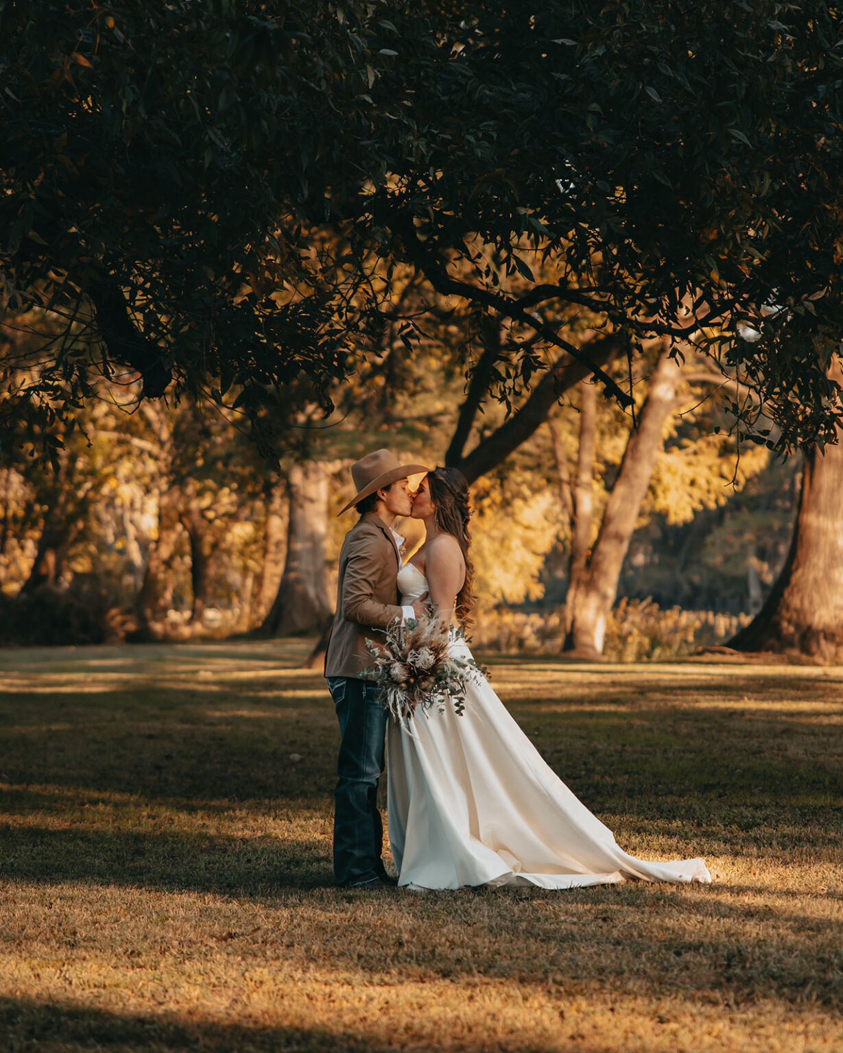 Rustic boho weddings often take place outdoors, so natural light is your biggest ally, and it really suits the boho look. It should come as no surprise that golden hour is ideal for portraits, and the same holds true here. Whenever possible, schedule couples portraits around it. Also, if you’re comfortable enough, try to shoot wide open at f/1.4–f/2 to maximize that warm glow.