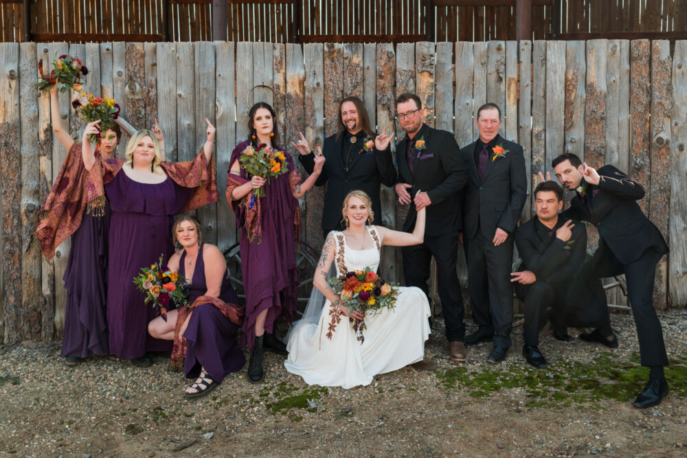 Large group of family and friends gather for a group shot at rustic boho weddings