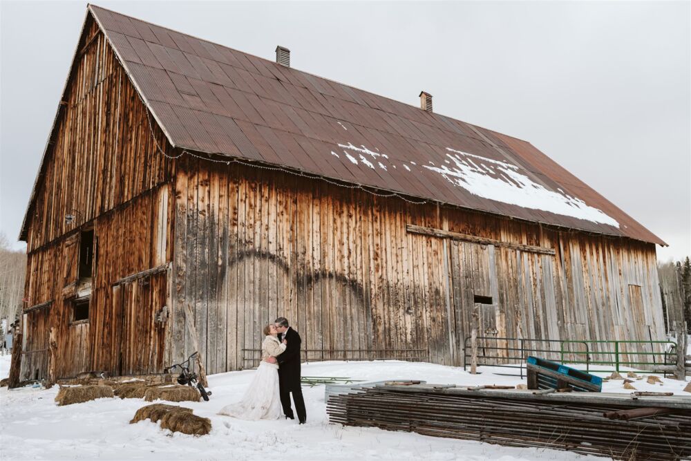 Newlyweds kiss in a barn during rustic boho weddings